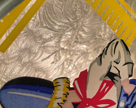 Although some Cab Lights have a front lens that is fully covered with translucent paint, most Cab Lights have portions of the front glass that are clear, enabling a view through to the back panel of the sign. These examples provide more of a three-dimensional look with a back “reflector” lens that typically had a finish similar to silver or gold foil. There were multiple styles of these back lenses with different finishes and the most attractive was a “glue-chipped” texture which reflected light at multiple depths and angles.